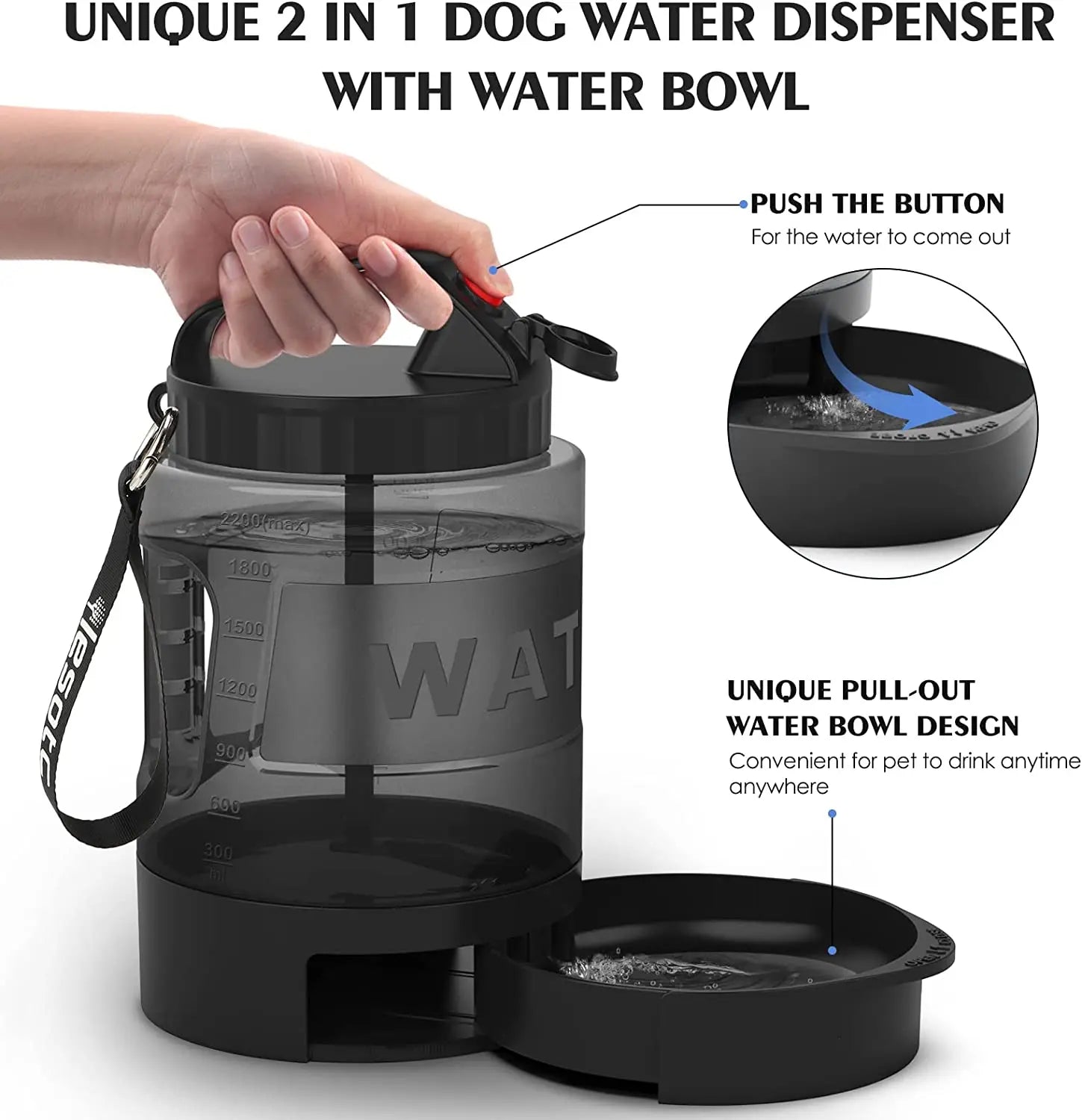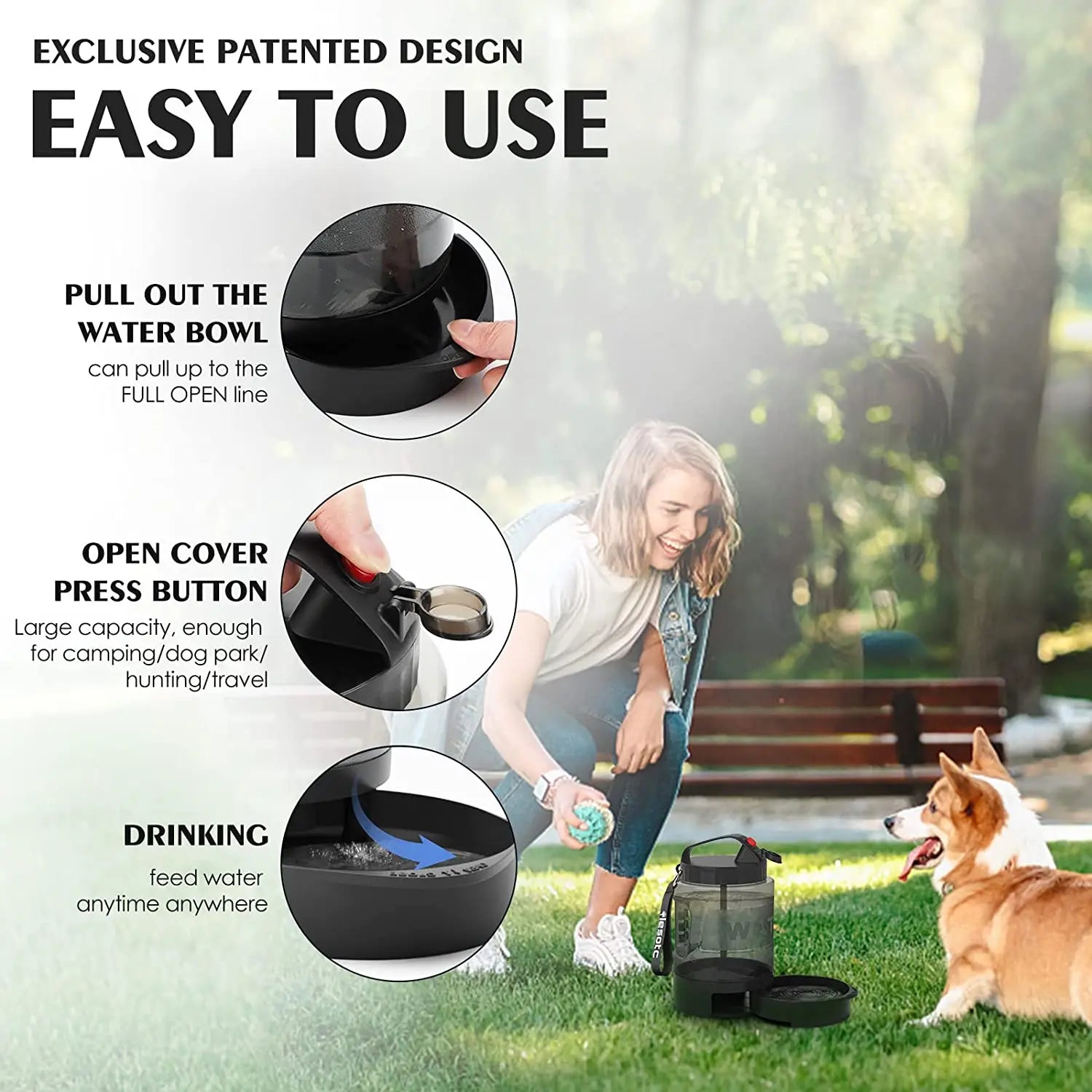 Built-in, pull-out water bowl eliminates the need to carry a separate dish.